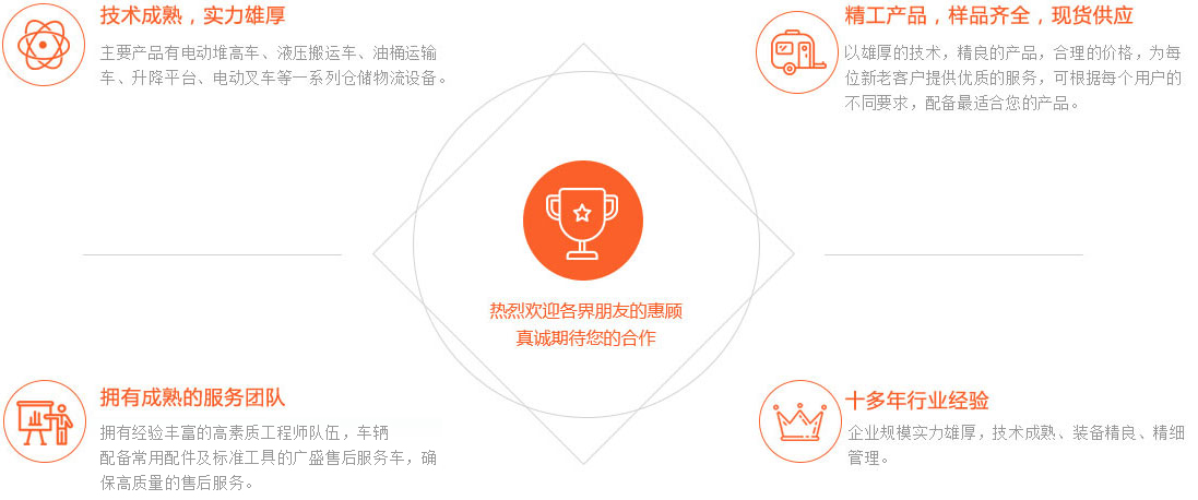 天津市廣盛搬運機械有限公司成立于2003年,是在國內倉儲搬運設備具有一定地位的專業(yè)生產制造服務商。主要產品有:電動堆高車、液壓搬運車、油桶運輸車、升降平臺車、電動叉車等一系列倉儲物流設備。十幾年來,我們一直致力于吸收、引進世界物流產品與技術,堅持不懈,創(chuàng)新發(fā)展,為國內外客戶提供安全、可靠、省力、高效、專用的各類物流搬運產品。